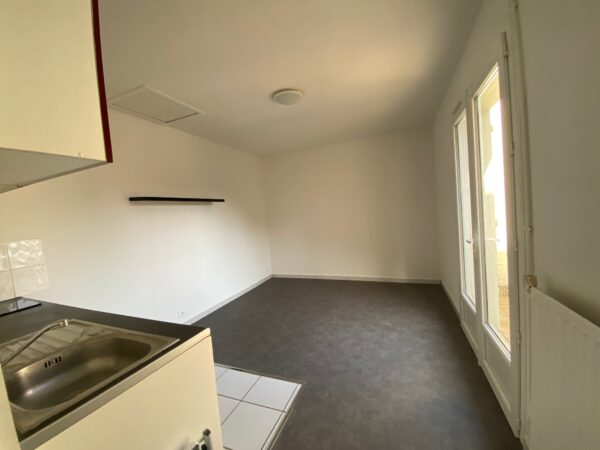 - 1 pièce à vivre avec 1 cuisine aménagée et équipée (plaques de cuisson électriques, placards, évier)
