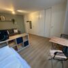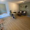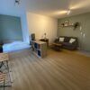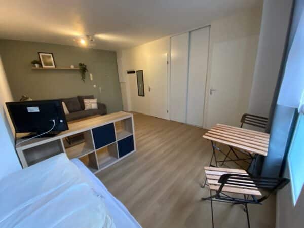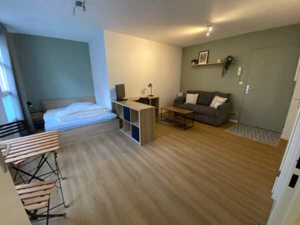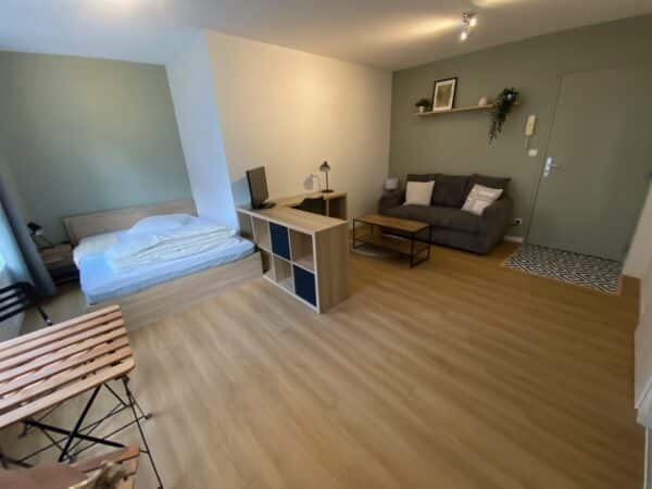 • 1 pièce à vivre avec 1 coin salon (canapé / table basse / bureau) et 1 coin chambre (lit 2 places et chevet, couettes/oreillers)