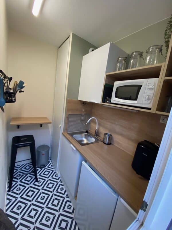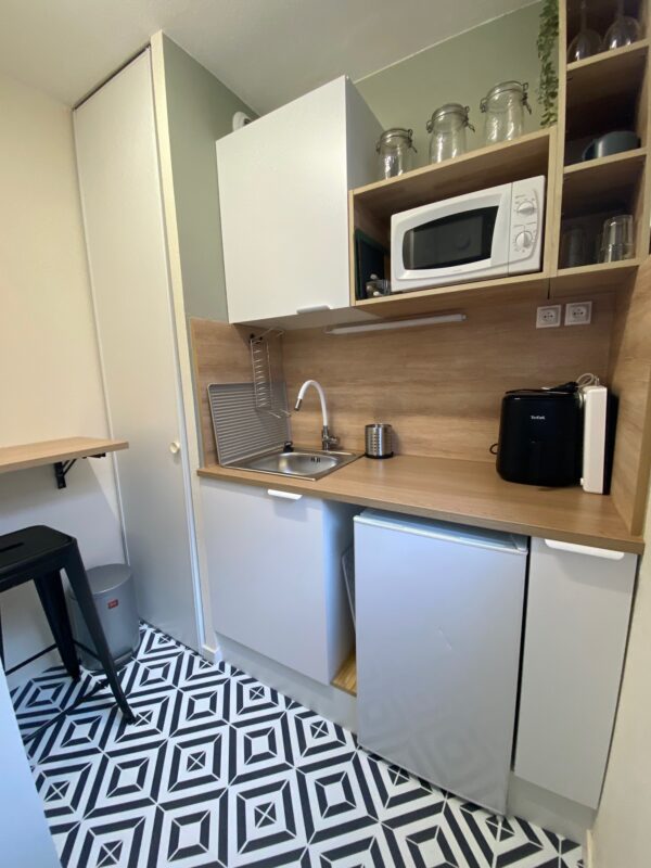 • 1 cuisine séparée toute aménagée et équipée (plaques de cuisson, placards, évier, Air Fryer, vaisselle)